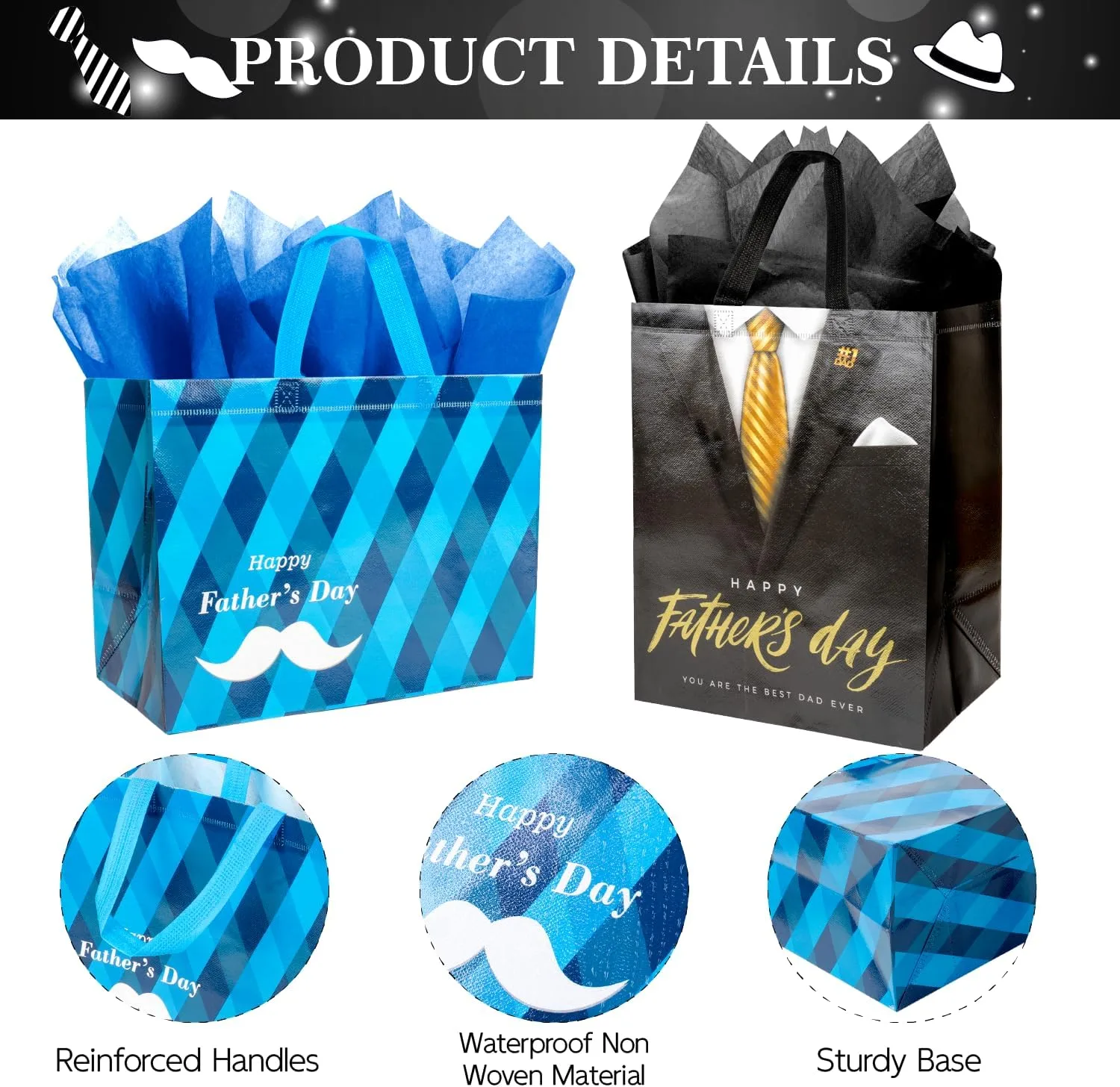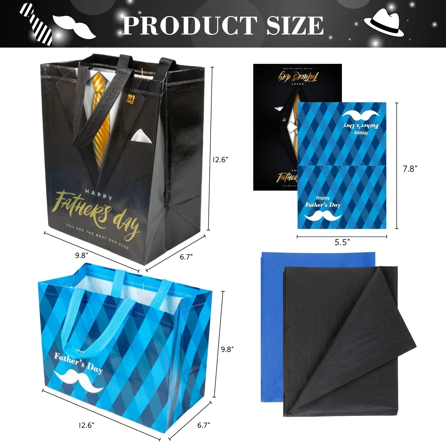 Each pack is a complete gifting solution! You will receive two reusable Father’s Day themed gift bags, two coordinating greeting cards (one for each bag, perfect for your heartfelt message), and four sheets of tissue paper (two sheets per bag) to add that elegant finishing touch to your gift presentation.