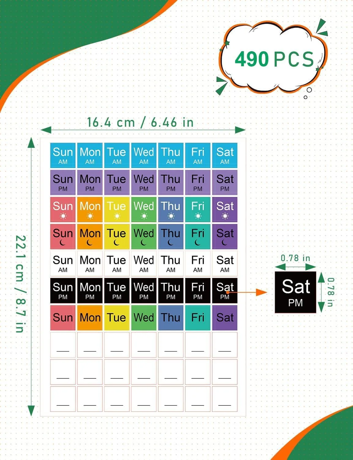 • A: The valued package includes a comprehensive set of 490 Medicine Reminder Stickers, plus additional blank labels for custom needs. You’ll find labels marked for each day of the week (Monday-Sunday), as well as specific time slots like “Morning,” “Evening,” and more. This extensive variety, combined with the flexibility of the blank labels, makes it incredibly easy to organize and label a full week’s, or even a month’s, worth of medication for multiple individuals, ensuring thorough and consistent tracking.