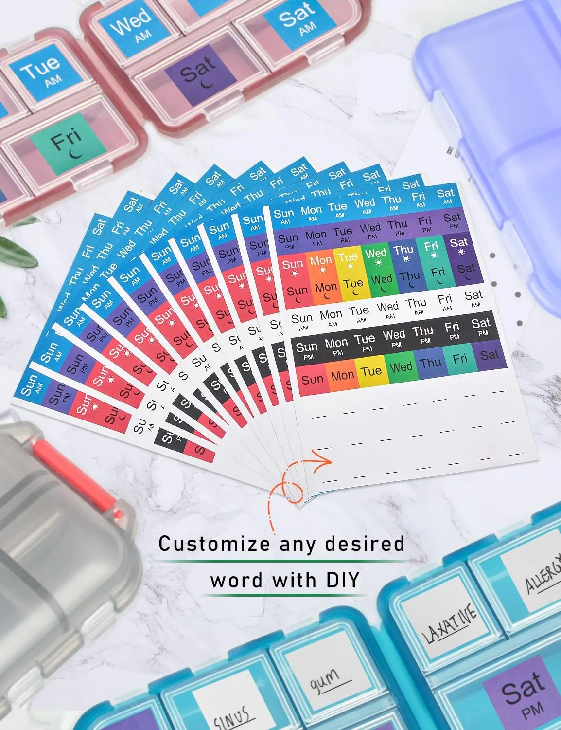 • A: Absolutely. These labels are crafted from premium, durable materials and printed with high-quality, non-toxic ink. They’re designed to withstand frequent handling and various environments, ensuring the text remains clear and legible. The strong adhesive ensures they stay firmly attached to your pill organizers or bottles, even when tossed into a bag for travel, without peeling or shifting. They’re built to last, providing reliable information for the long haul.