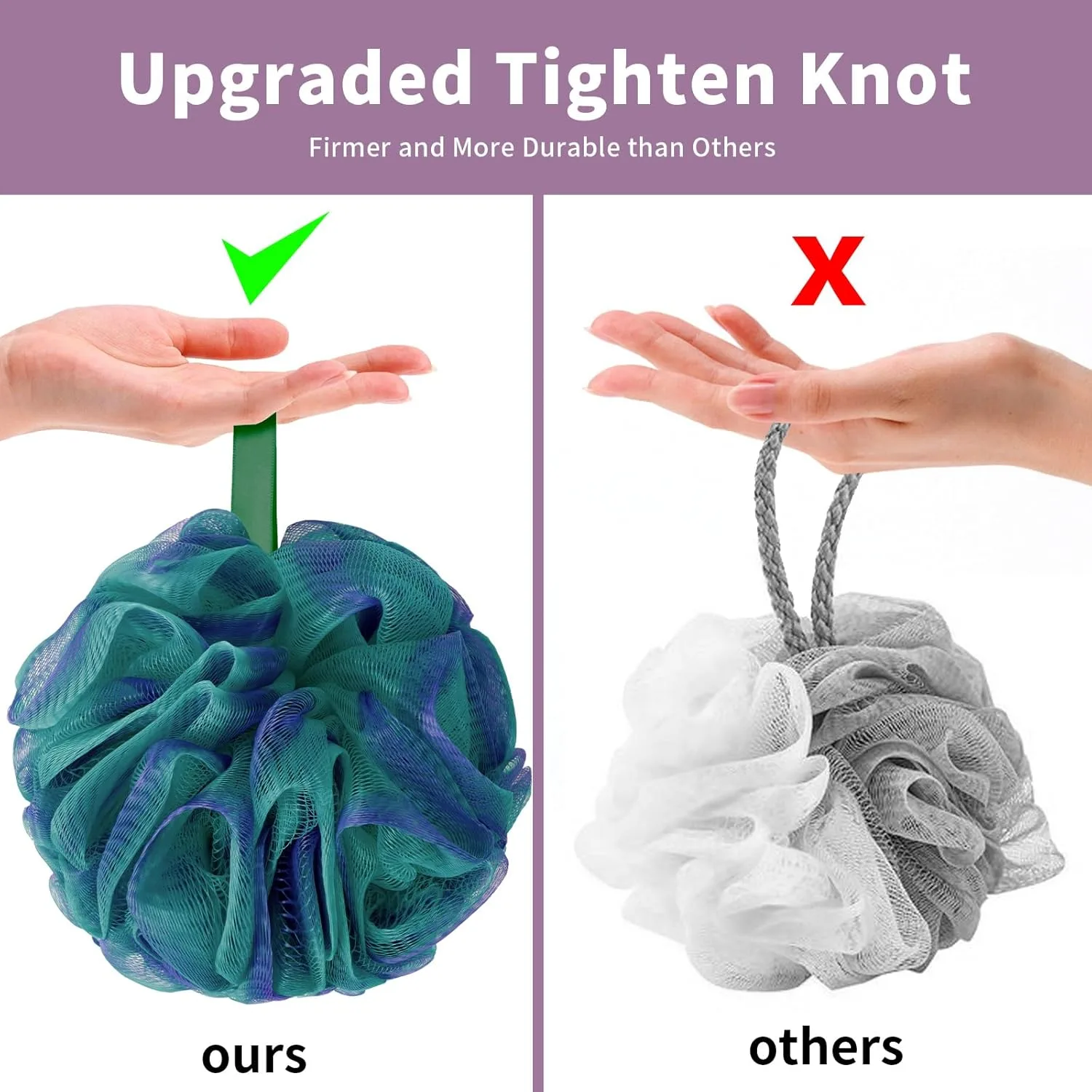 A: Durability feedback is somewhat mixed, which is common for bath accessories given varying usage habits. Many customers report that the loofahs last a long time, appreciating their resilience. The integrated hanging ribbon is a key feature here, as it allows the loofah to dry thoroughly between uses, which significantly extends its lifespan and prevents mildew. However, like any mesh product, vigorous use or specific water conditions might affect some units more quickly. For optimal longevity, ensure it hangs freely to dry after each use.